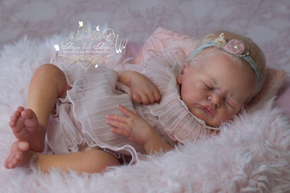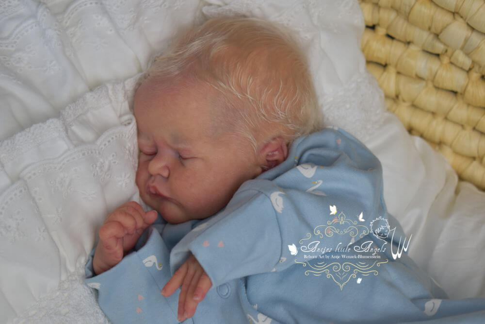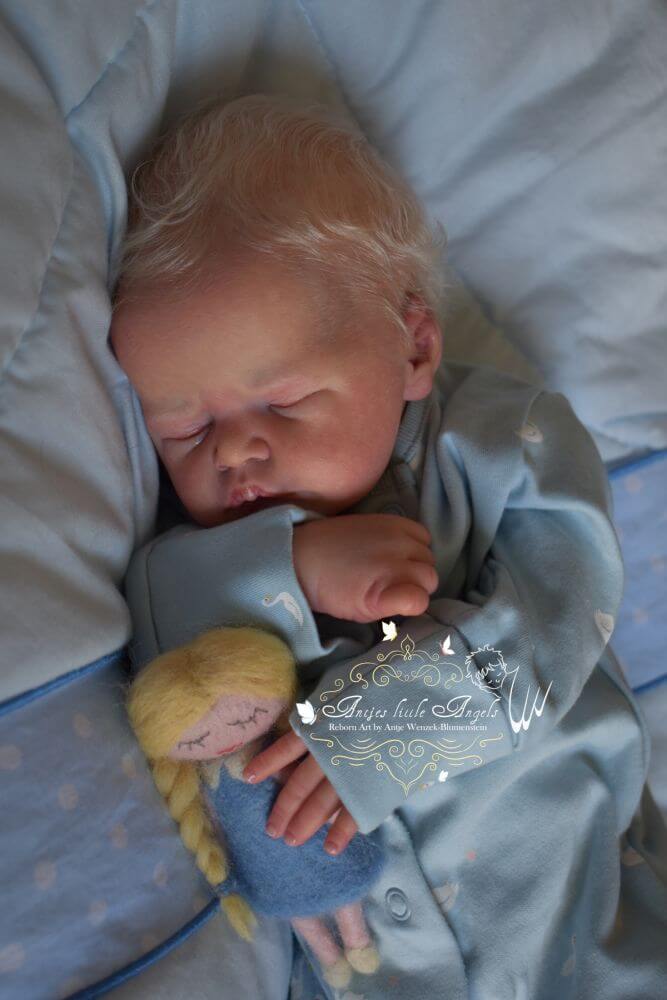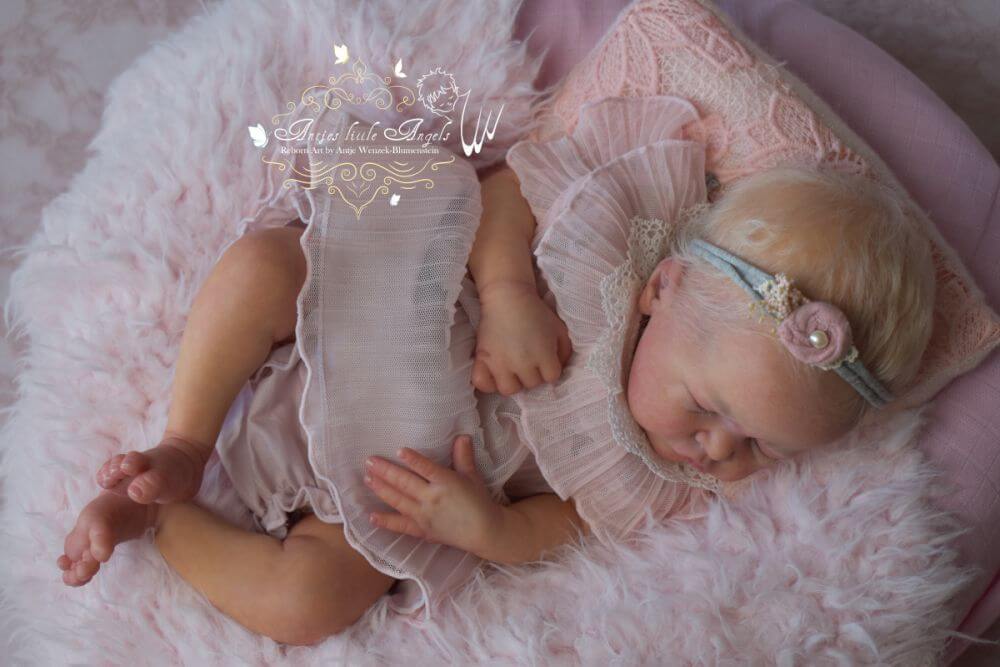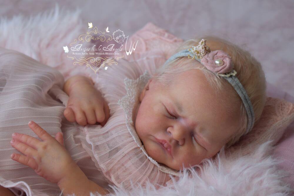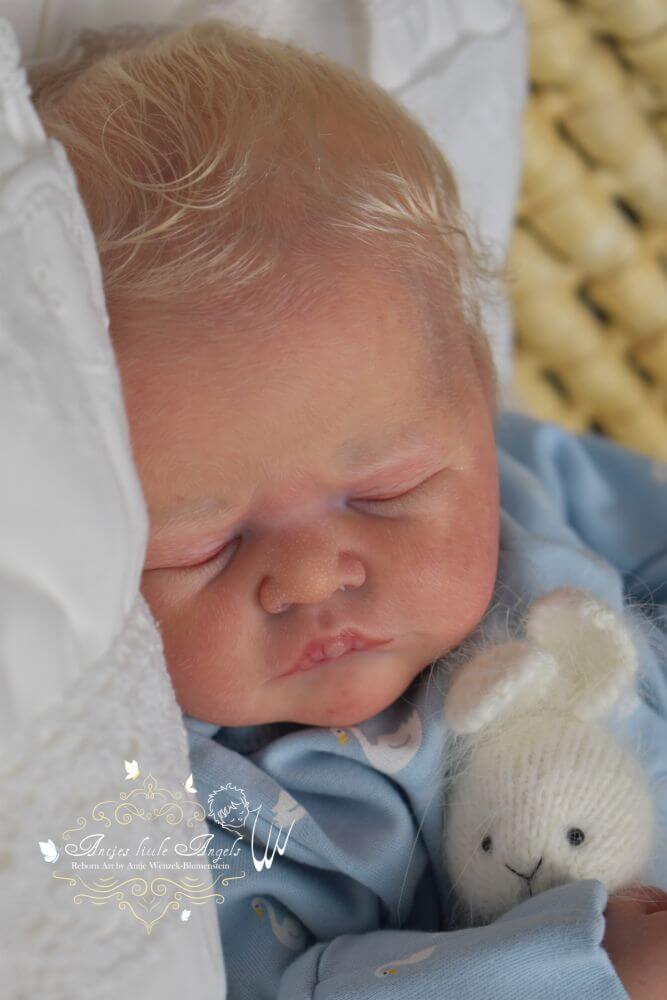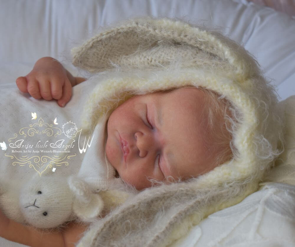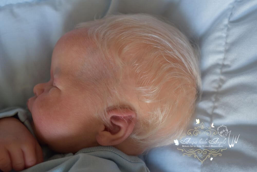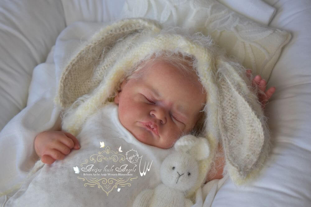 Die kleine Gretel wurde modelliert von Emily Jameson. Sie ist ein ganz zartes kleines Baby von 44 cm Größe.Gretel hat lange Arme und Beine, die in einen Einbindekörper gebunden. Sie hat leicht gewelltes, wunderbar weiches Mohair in der Farbe blond von Susan Nagel. Gretel hat eine Neugeborenen Färbung mit allen Merkmalen.