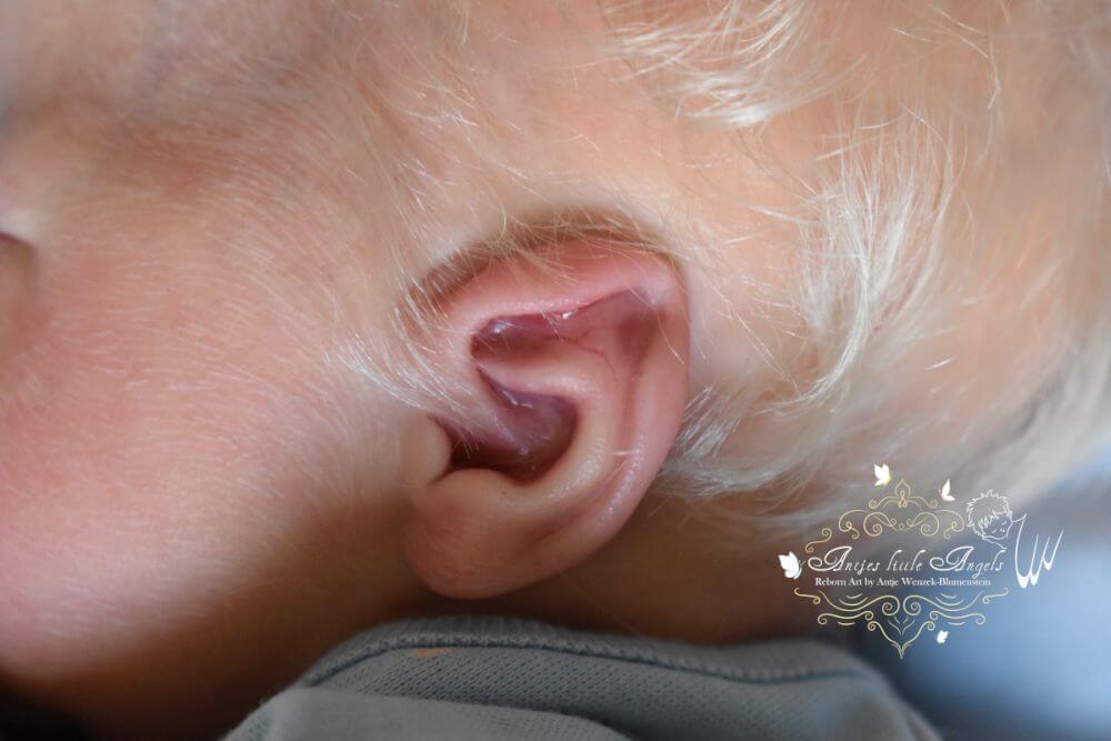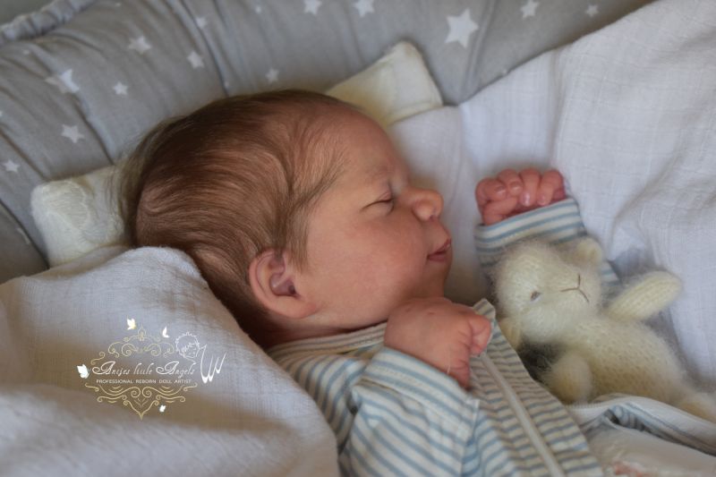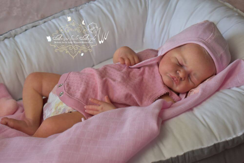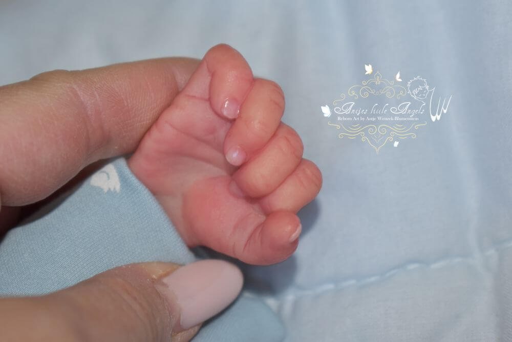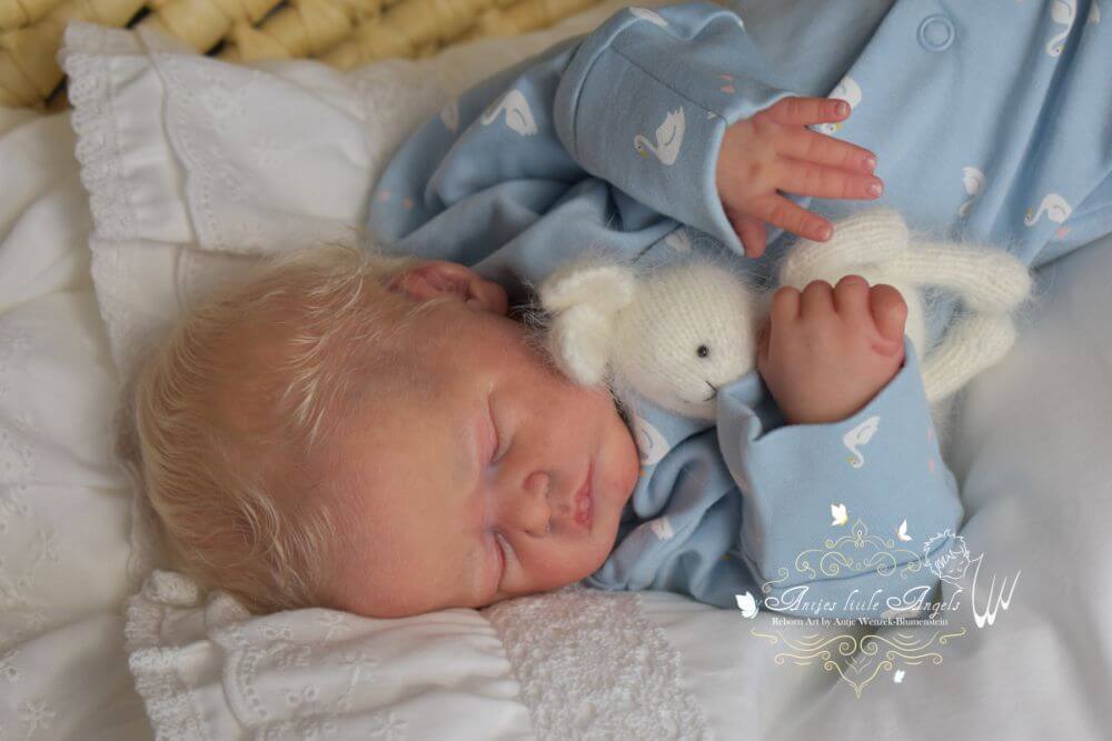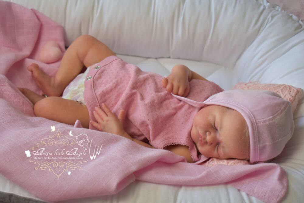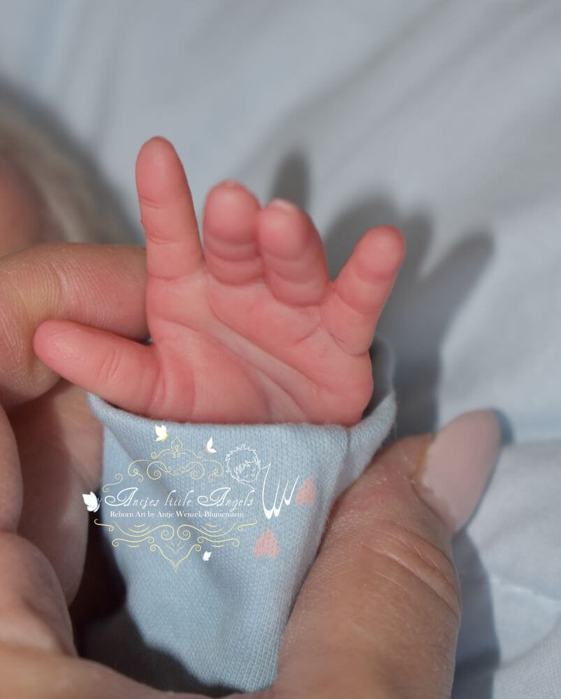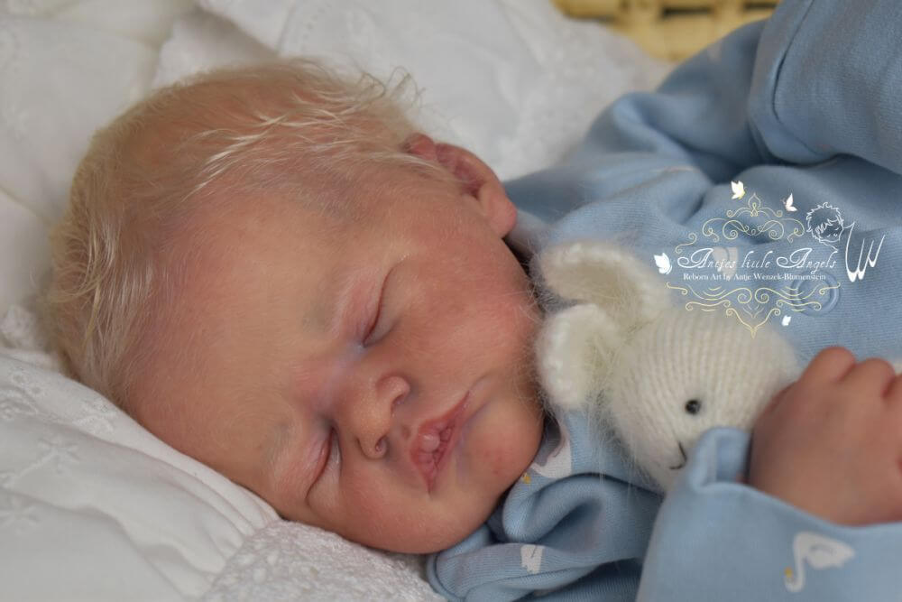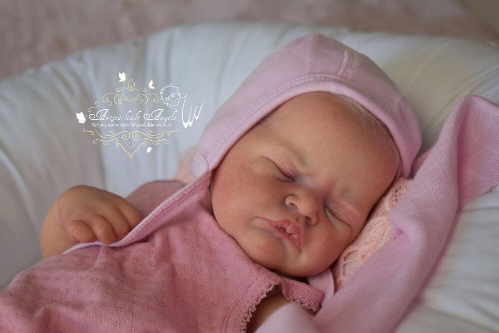 Die kleine Gretel wurde modelliert von Emily Jameson. Sie ist ein ganz zartes kleines Baby von 44 cm Größe.Gretel hat lange Arme und Beine, die in einen Einbindekörper gebunden. Sie hat leicht gewelltes, wunderbar weiches Mohair in der Farbe blond von Susan Nagel. Gretel hat eine Neugeborenen Färbung mit allen Merkmalen.